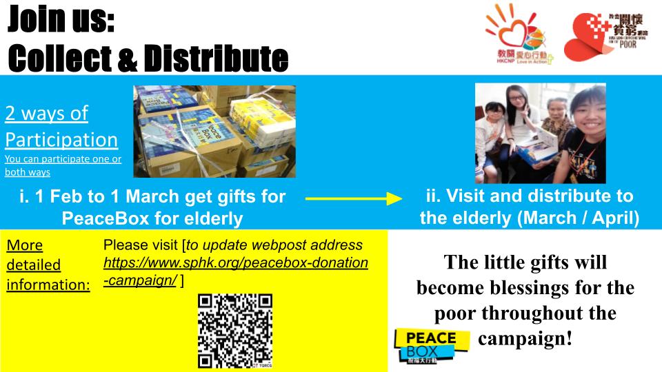 2. Join us by giving out PeaceBox: Share your love by visiting underprivileged people with beautifully packed Peacebox gift packs. Our NGO partner HKCNP will connect us with a local partner church for the distribution and interaction.